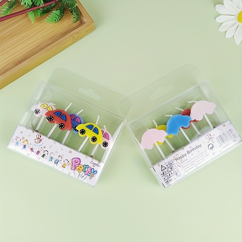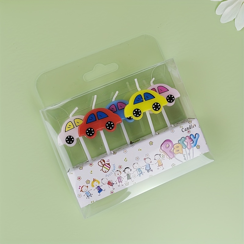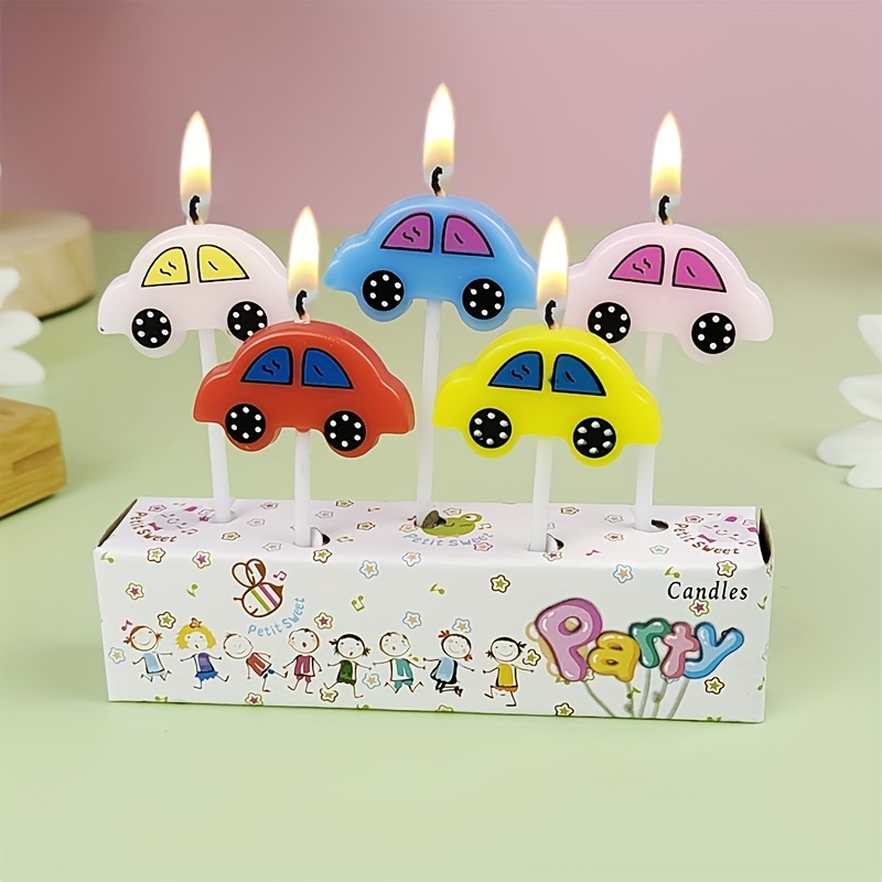 Each set includes 5 brightly colored candles in playful car designs – perfect for car-loving kids and themed parties.
