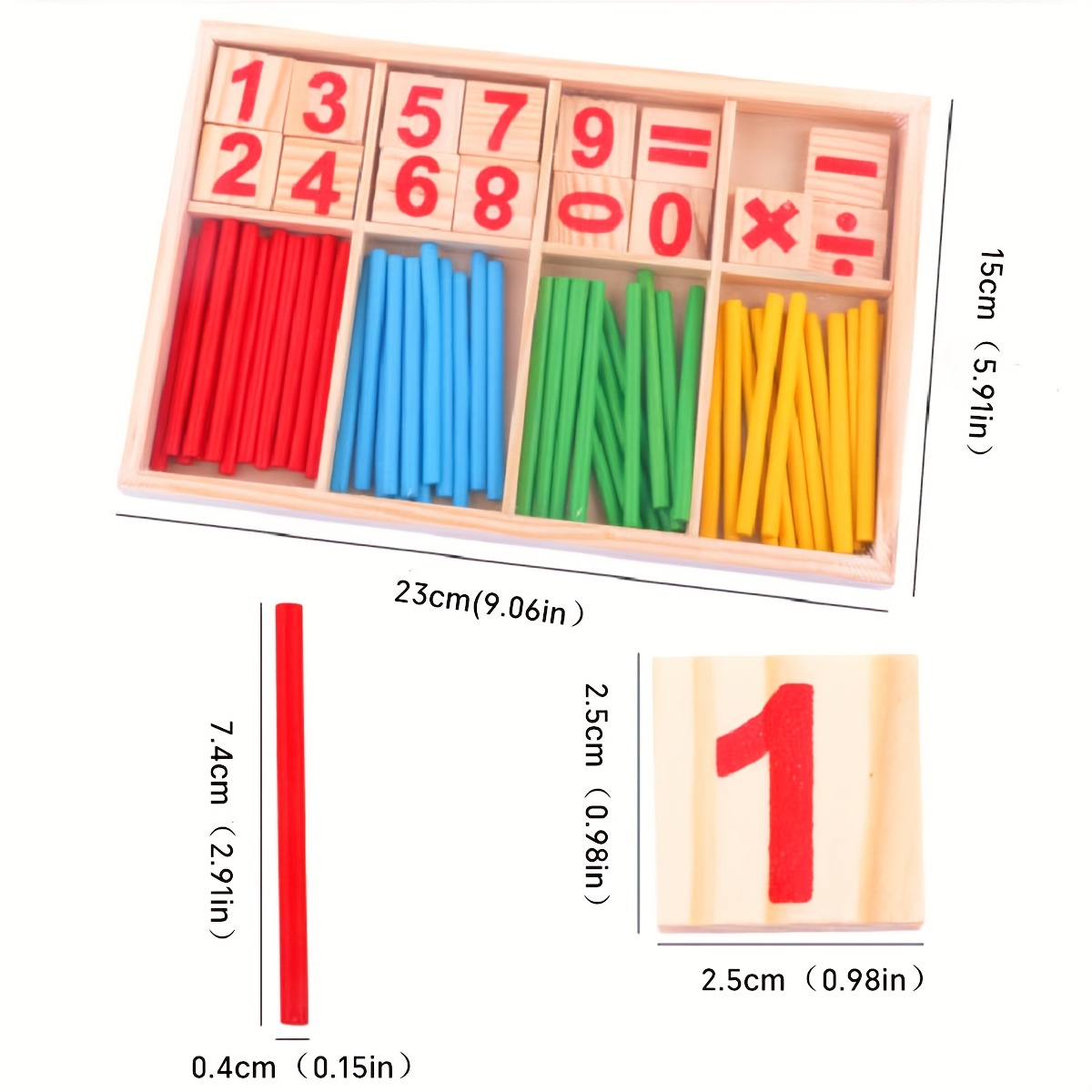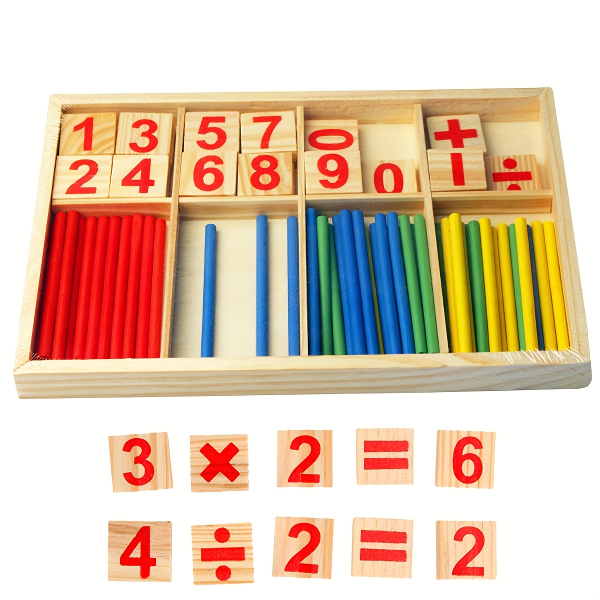 • Includes: Colorful counting sticks + number and symbol tiles