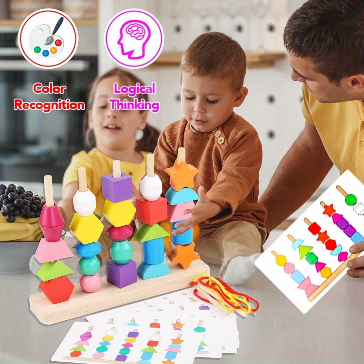 - 3-in-1 Learning Fun: Includes stacking blocks, lacing beads, and a shape matching stacker โ ideal for teaching color recognition, sequencing, counting, and coordination.